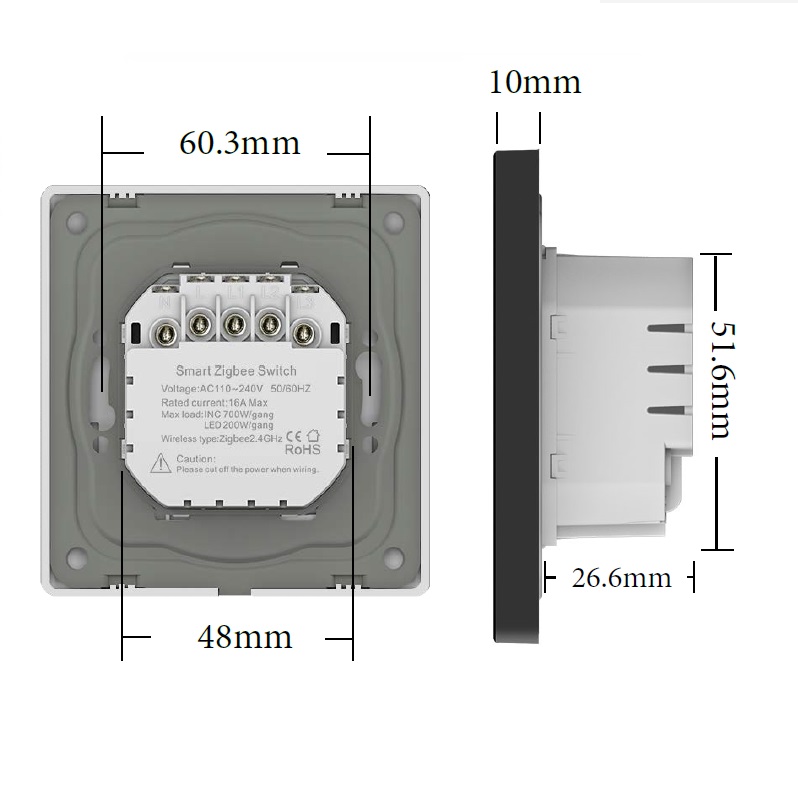 Creon Glowa W WiFi/ZigBee IoT Glass smart switches, Input voltage AC 110-240~50/60Hz, Live & Neutral wiring, Load – Inductive ≤ 700W/Gang LED: ≤ 300W/Gang 16A max, ZigBee and WiFi Direct protocols, V0 Fire-retardent PC/ Skin surface glass, Electric lifespan 100,000 times, Protocol IEEE 802.15.4, 2.4GHz, Button lifespan 5 million times, Size(LxWxH)86x86mmx36.6mm, Gray Finish, Internet configure setup or re-set by press the button for 10 seconds, indicator light, blinks in green, Wall recessed / Flush mountingWorking Temperature -20°C to 45°C.